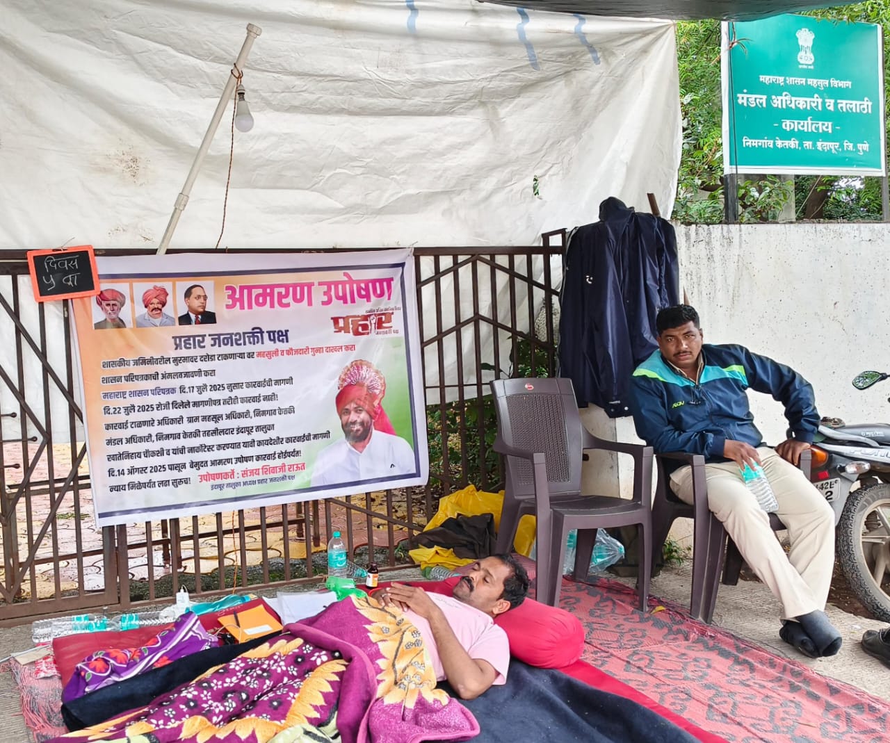 इंदापूर तालुक्यातील निमगाव केतकी येथील शासकीय जमिनीवरील बेकायदेशीर मुरूम उत्खनन, वाहतूक व साठा करणाऱ्या व्यक्तीच्या विरोधात निमगाव केतकी येथील मंडल अधिकारी कार्यालय या ठिकाणी प्रहार जनशक्ती पक्षाचे तालुकाध्यक्ष संजय राऊत यांनी दि. १४ ऑगस्ट पासून आमरण उपोषण केले आहे.