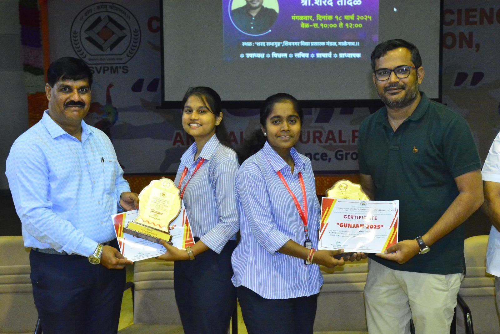 यामध्ये सावित्रीबाई फुले पुणे विद्यापीठ परीक्षा मे -जून 2024 मध्ये प्रथम, द्वितीय व तृतीय क्रमांकाने उत्तीर्ण होणाऱ्या विद्यार्थ्यांना अनुक्रमे प्रथम क्रमांक 4000/-, द्वितीय क्रमांक 3000 /- आणि तृतीय क्रमांक 2000/- रुपये असे एकूण 1 लाख 8 हजार रुपयांचे रोख तसेच ‘गुंजन’या सांस्कृतिक कार्यक्रम अंतर्गत पार पडलेल्या विविध स्पर्धांचे तसेच क्रीडा स्पर्धेचे बक्षीस ट्रॉफी व प्रशस्तीपत्र स्वरूपात देऊन विद्यार्थ्यांचा गुणगौरव व सत्कार करण्यात आला.