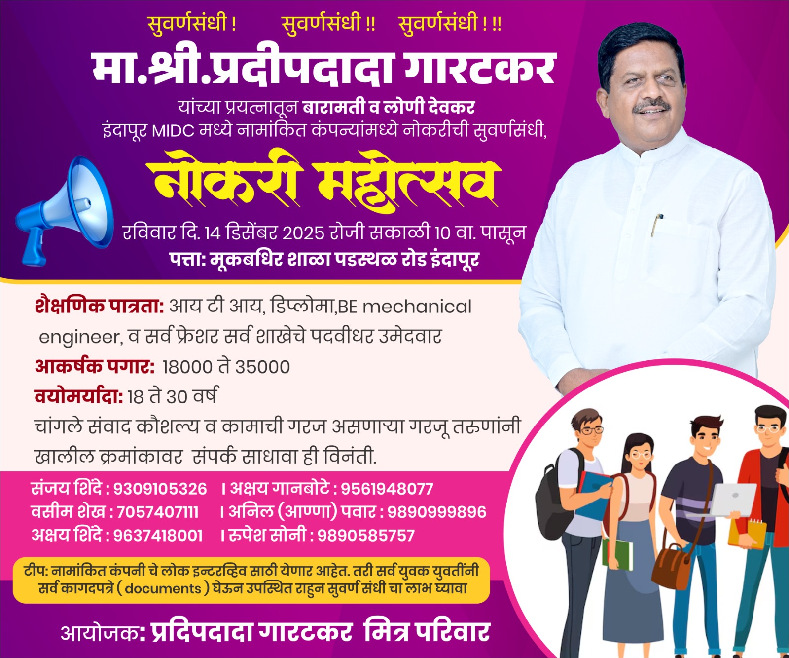 इंदापूर तालुक्यातील व शहरातील युवकांना रोजगाराच्या संधी उपलब्ध करून देण्यासाठी उद्या (दि.13) डिसेंबर रोजी इंदापुरात प्रदीप गारटकरांच्या प्रयत्नातून नोकरी महोत्सवाचे आयोजन केले आहे. तालुक्यातील लोणी देवकर आणि बारामती औद्योगिक क्षेत्रातील विविध मानांकित उद्योग कंपन्यांमध्ये तरुणांना नोकरीची संधी मिळावी, रोजगार वाढावा आणि स्थानिक कौशल्यांना योग्य व्यासपीठ मिळावे, या हेतूने या नोकरी मेळाव्याचे आयोजन केले आहे. यामध्ये सहभागी होऊ इच्छिणाऱ्यांनी रविवारी इंदापूर शहरातील पडस्थळ रस्त्यावरील मूकबधिर शाळा येथे उपस्थित राहण्याचे आवाहन प्रदीप गारटकर मित्र परिवाराने केले आहे.