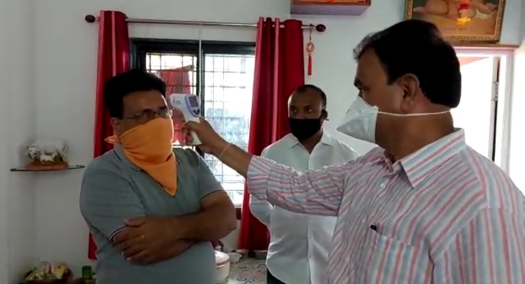 इंदापूरमध्ये सर्वेक्षणाचा आढावा घेत राज्यमंत्री दत्तात्रय भरणे यांनी केली थर्मामीटर गणच्या साह्याने अनेक कुटुंबांची तपासणी.