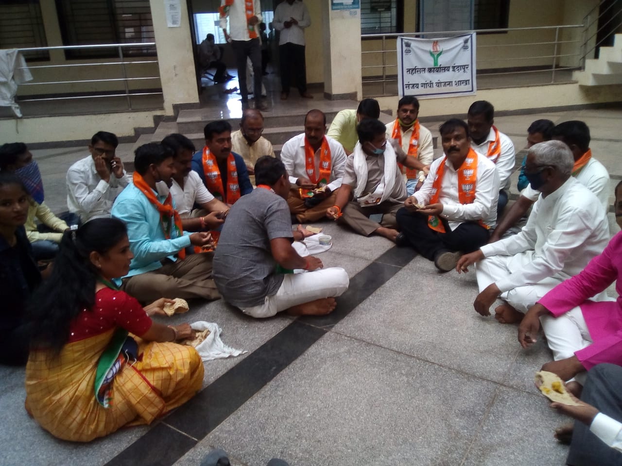 इंदापूर तहसील कार्यालयात पिठलं भाकरी वाटून भाजपा कार्यकर्त्यांनी नाेंदवला महाविकास आघाडी सरकारचा निषेध