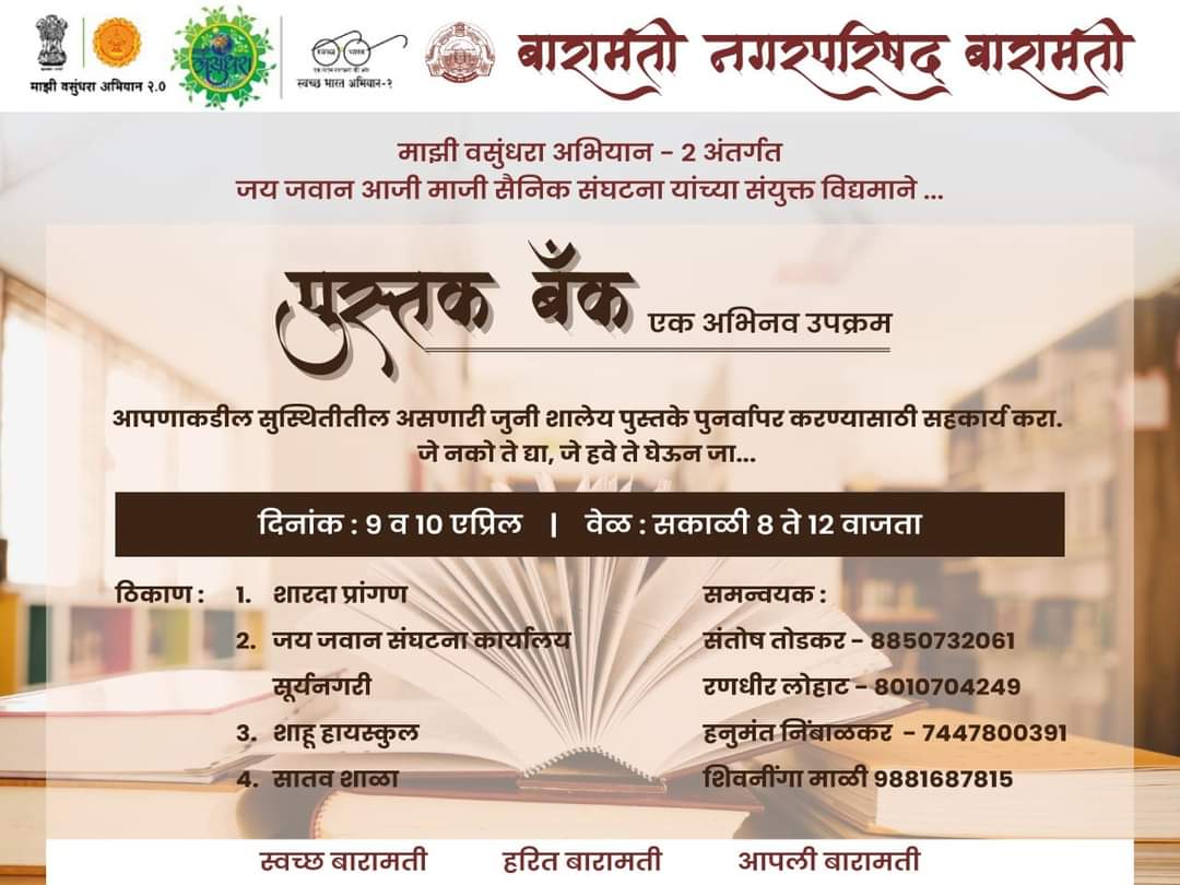 गरजू,आर्थिकदृष्ट्या कमकवुत,गरीब विद्यार्थ्यांना शैक्षणिक पुस्तके सहज व कमी वेळेत गरजेनुसार उपलब्ध होणे साठी तालुक्यातील जय जवान माजी सैनिक संघटना व बारामती नगरपरिषद यांच्या सयूंक्त विद्यमानाणे ‘पुस्तक बँक’ हा अभिनव उपक्रम राबविण्यात येत आहे .
