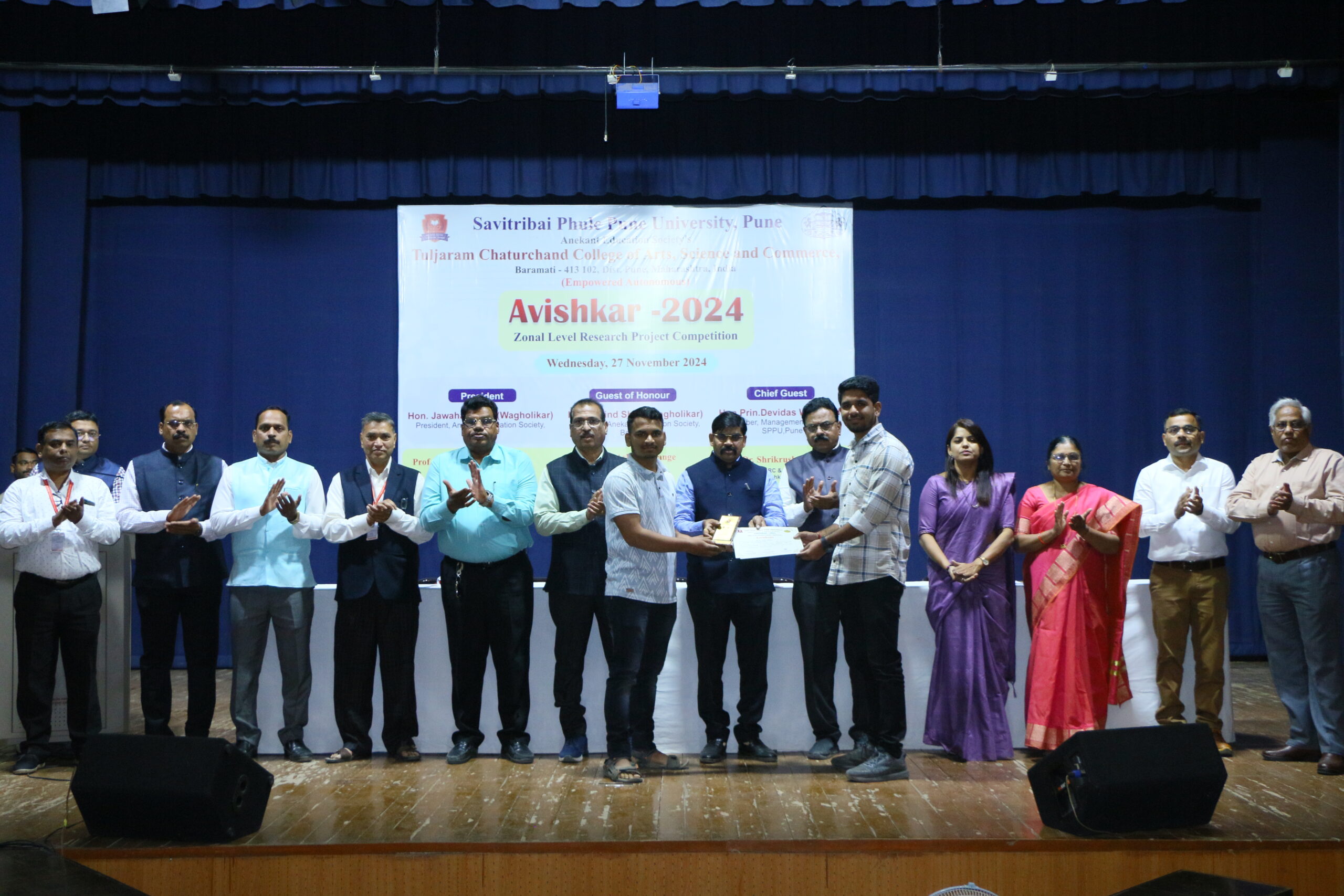 स्पर्धेचा पारितोषिक वितरण सोहळा महाविद्यालयाच्या जीवराज सभागृहामध्ये सायंकाळी ४ वाजता पार पडला. संशोधन हे सकारात्मक आणि माणसाला जीवनदान देणारे असावे. विद्यार्थ्यांमध्ये खूप कौशल्ये आहेत, त्यांची संशोधक वृत्ती जोपासली पाहिजे असे उदगार पुणे विद्यापीठाचे व्यवस्थापन परिषद सदस्य प्रा. डॉ. देविदास वायदंडे यांनी प्रमुख पाहुणे म्हणून बोलत असताना काढले. सावित्रीबाई फुले, पुणे विद्यापीठ संशोधनाला प्राधान्य देते असेही यावेळी सांगितले. या कार्यक्रमाचे अध्यक्षपद महाविद्यालयाचे प्राचार्य प्रा.डॉ.अविनाश जगताप यांनी भूषविले. ‘