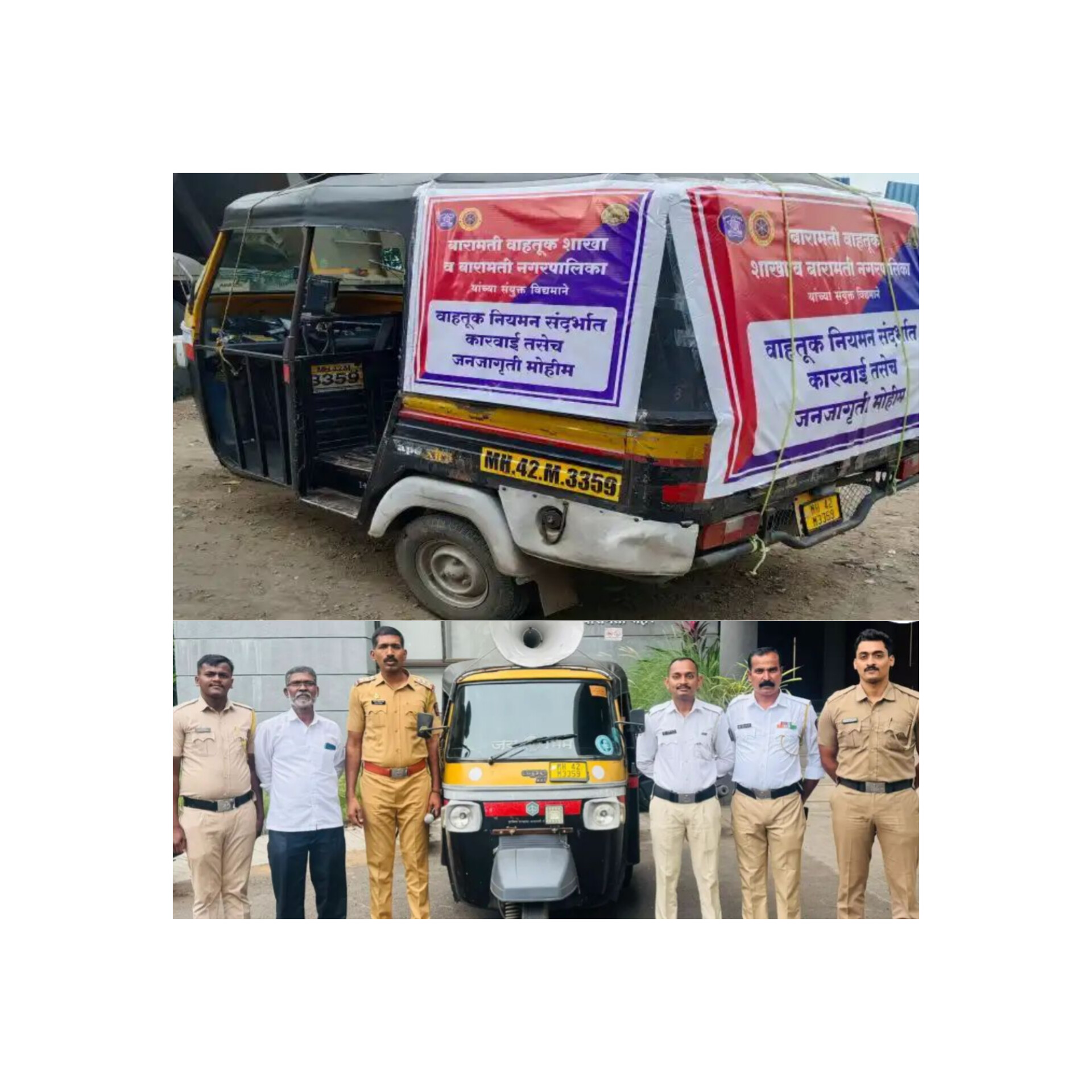 बारामती वाहतूक शाखा आणि बारामती नगरपालिका यांच्या संयुक्त विद्यमाने रस्त्यावर शिस्त आणण्याचा उपक्रम हाती घेण्यात आला आहे. या पार्श्वभूमीवर एक रिक्षा शहरभर फिरतेय, त्यावर मोठे फलक झळकत आहेत आणि लाऊडस्पीकरवरून नागरिकांना सूचना दिल्या जात आहेत. कुठे गाडी लावून अडथळा केला, कुणी नियम तोडले तर त्यावर तात्काळ कारवाई केली जात आहे.