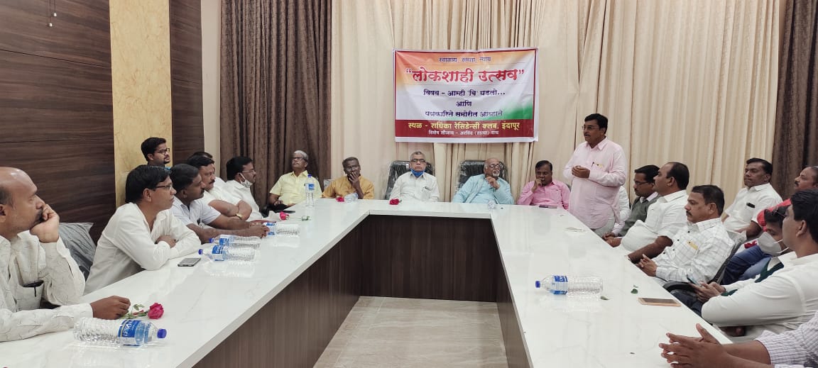 इंदापूर येथील राधिका रेसिडेन्सी क्लब मध्ये “लोकशाही उत्सवा” निमित्त आम्ही ‘बी’ घडलो आणि ‘पत्रकारितेसमोरील आव्हाने’ या विषयावर चर्चासत्राचे आयोजन करण्यात आले होते. त्यावेळी ज्येष्ठ पत्रकार अतुल तेरखेडकर बोलत होते. कार्यक्रमास साथी सलीम शेख, डॉ. विकास शहा, ज्येष्ठ पत्रकार मधुकर गलांडे, बहुजन मुक्ती पार्टीचे राष्ट्रीय महासचिव राहुल मखरे, इंदापूर नगरपरिषदेचे गटनेते कैलास कदम, राष्ट्र सेवा दलाचे जिल्हा संघटक गफूर सय्यद, रिपब्लिकन पार्टी ऑफ इंडियाचे जिल्हा संघटक सचिव शिवाजी मखरे, रिपब्लिकन पार्टी ऑफ इंडियाचे तालुकाध्यक्ष संदिपान कडवळे,राहुल ढवळे,नीलकंठ मोहिते, सुरेश जकाते, महेश स्वामी,सागर शिंदे,सुरेश मिसाळ, काकासाहेब मांढरे, धनंजय कळमकर, संतोष दहिदुले, देवीदास राखुंडे,सिद्धार्थ मखरे, श्रेयश नलवडे,हमीद आत्तार,जितेंद्र जाधव,सत्यजित रणवरे,दीपक खिलारे,तात्याराम पवार, शिवकुमार गुणवरे,जावेद शेख आदी उपस्थित होते.
