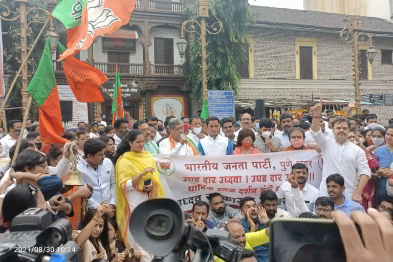 परवानगी नाकारल्यानंतरही कसबा पेठ गणपती मंदिरासमोर घंटानाद आंदोलन भाजपने केले होते. याप्रकरणी भाजपचे प्रदेशाध्यक्ष चंद्रकांत पाटील यांच्यासह भाजपचे नगरसेवक आणि पदाधिकारी यांच्या विरोधात फरासखाना पोलीस ठाण्यात गुन्हा दाखल करण्यात आला आहे.