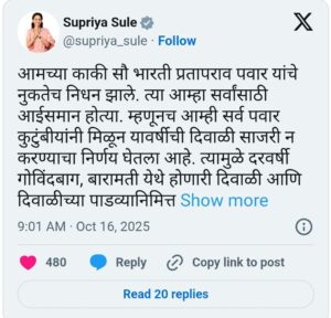 सुप्रिया सुळेंनी नुकतंच याबद्दल एक ट्वीट केले आहे. या ट्वीटमध्ये त्यांनी यंदाच्या दिवाळीबद्दल महत्त्वाची पोस्ट टाकली आहे. आमच्या काकी सौ भारती प्रतापराव पवार यांचे नुकतेच निधन झाले. त्या आम्हा सर्वांसाठी आईसमान होत्या. म्हणूनच आम्ही सर्व पवार कुटुंबीयांनी मिळून यावर्षीची दिवाळी साजरी न करण्याचा निर्णय घेतला आहे. त्यामुळे दरवर्षी गोविंदबाग, बारामती येथे होणारी दिवाळी आणि दिवाळीच्या पाडव्यानिमित्त होणारा सहृदांच्या भेटीचा कार्यक्रम देखील यावर्षी होणार नाही, कृपया आपण सर्वांनी याची नोंद घ्यावी. आपणा सर्वांना ही दिवाळी आनंदाची, सुखसमृद्धीची आणि भरभराटीची जावो ही सदिच्छा, अशी माहिती पवार कुटुंबियांच्या वतीने सुप्रिया सुळे यांनी दिली आहे.