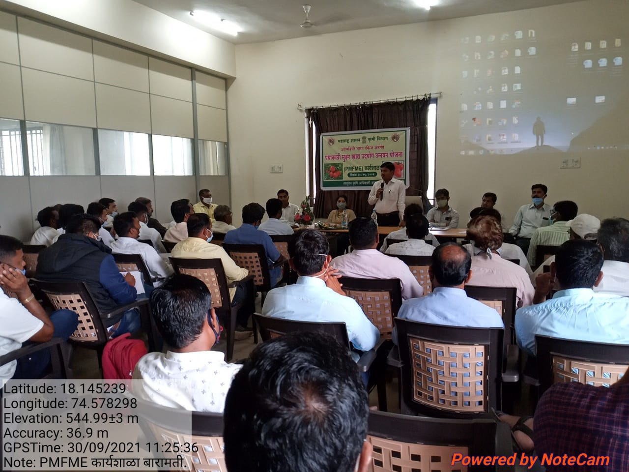 कृषी तंत्रज्ञान व्यवस्थापन यंत्रणा (आत्मा) पुणे यांचे संयुक्त विद्यमाने तालुका कृषि अधिकारी कार्यालय बारामती येथे प्रधानमंत्री सुक्ष्म खाद्य उन्नयन योजनेमध्ये सहभागी होऊ इच्छित असलेल्या प्रक्रियादार, शेतकरी गट, वैयक्तीक लाभार्थी यांचेकरिता प्रशिक्षण कार्याक्रमांचे उदघाटन उपविभागीय कृषि अधिकारी, बारामती वैभव तांबे यांच्या हस्ते झाले.