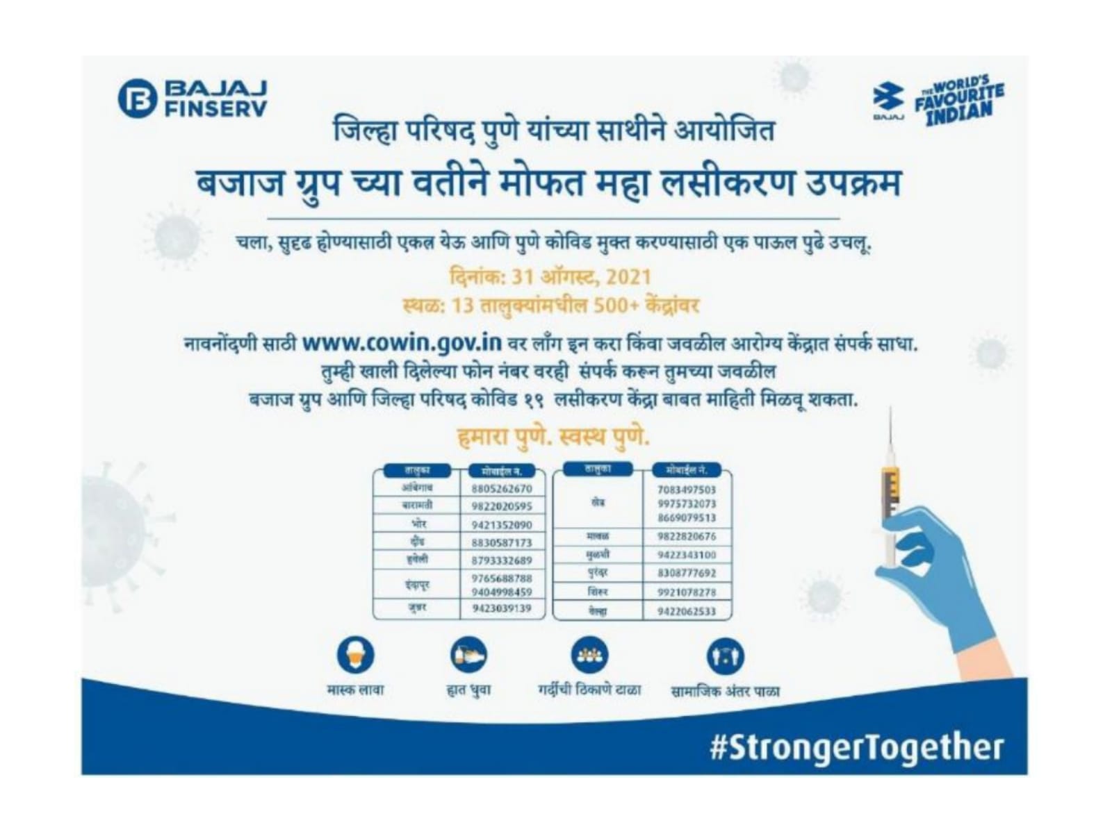 बजाज ग्रुप कंपन्या – बजाज ऑटो आणि बजाज फायनान्स लिमिटेडने जिल्हा परिषदेसोबत मिळून कोव्हीशिल्डच्या १.५ लाख डोसचे वाटप केले. ही लसीकरण मोहीम पुण्यातील आंबेगाव, बारामती, भोर, दौंड, हवेली, इंदापूर, जुन्नर, खेड, मावळ, मुळशी, पुरंदर, शिरूर आणि वेल्हा तालुक्यात आयोजित करण्यात येणार आहे.
