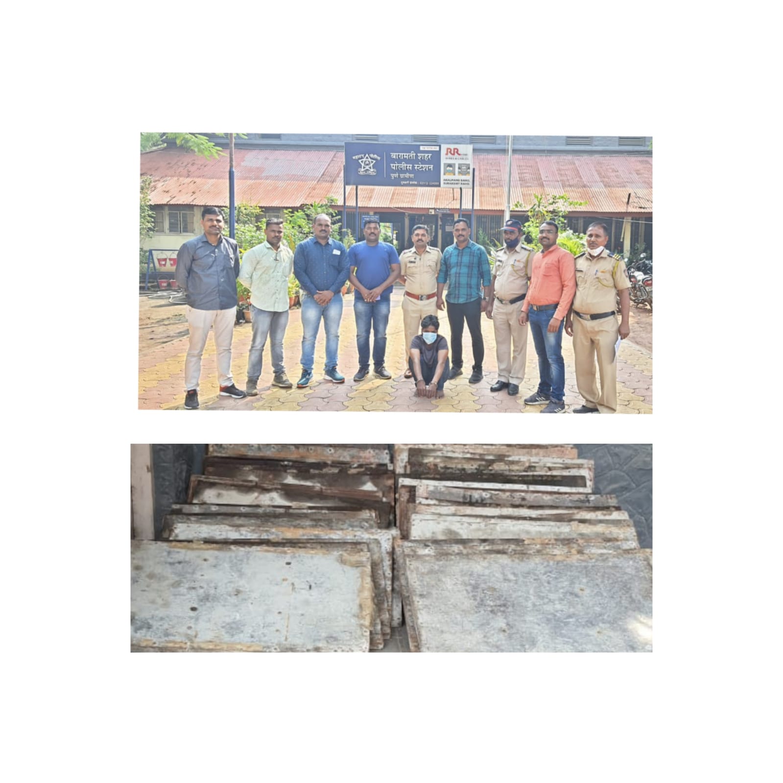 बारामती शहर पोलीस ठाण्याचे तपास पथक हे या गुन्ह्याबाबत सतत गोपनीय माहिती घेत होती त्याप्रमाणे तपास पथकाच्या गोपनीय बातमी दारा मार्फत माहिती मिळाली की आरोपी नामे बकुळया नकट्या काळे वय 20 वर्ष राहणार मळद भैय्या वस्ती जवळ याने एका विधिसंघर्षग्रस्त बालक सोबत सदरच्या प्लेट चोरलेल्या आहेत सदर माहितीच्या आधारे तपास पथकाने सदर आरोपीला ताब्यात घेऊन त्याला अटक करून त्याच्या ताब्यातून चोरीस गेलेल्या संपूर्ण 50 प्लेटा 75 हजाराच्या जप्त करण्यात आलेले आहेत.