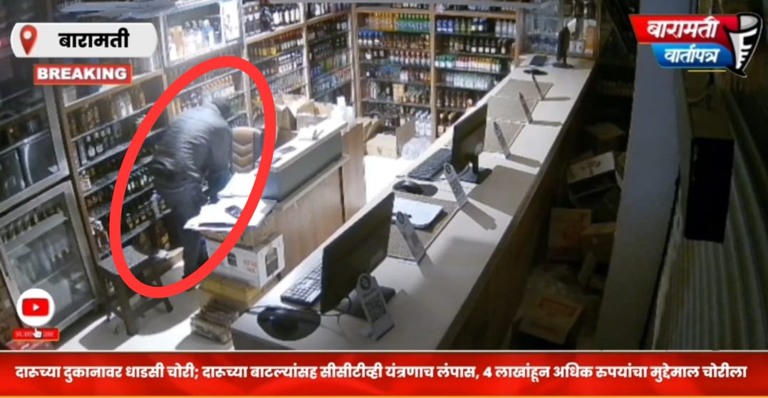 बारामती शहरात खळबळ, ४ लाखांहून अधिक रुपयांचा मुद्देमाल चोरीला बारामती शहरातील साठे नगर चौक परिसरात असलेल्या नितीन वाईन शॉप या दारूच्या दुकानावर अज्ञात चोरट्यांनी धाडसी चोरी केल्याची धक्कादायक घटना उघडकीस आली आहे. चोरट्यांनी दुकानातील महागड्या दारूच्या बाटल्यांसह संपूर्ण सीसीटीव्ही यंत्रणा आणि संगणक असा तब्बल ४ लाख ५ हजार ९६५ रुपयांचा मुद्देमाल लंपास केल्याने शहरात एकच खळबळ उडाली आहे.