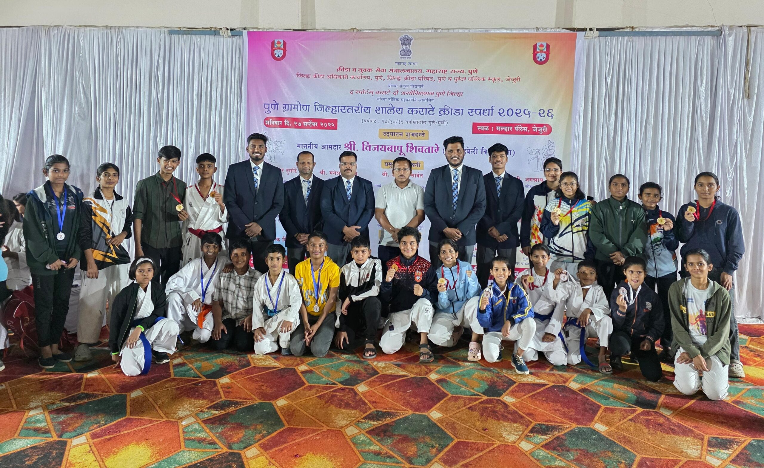 जेजुरी येथे क्रीडा व युवक सेवा संचालनालय, महाराष्ट्र राज्य, जिल्हा क्रीडा परिषद पुणे व जिल्हा क्रीडा अधिकारी कार्यालय पुणे यांच्या वतीने पुणे ग्रामीण शालेय जिल्हास्तरीय कराटे स्पर्धा – २०२५ उत्साहात पार पडली.