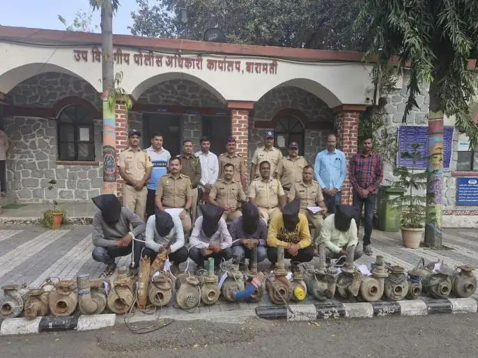 याप्रकरणी अप्पर पोलीस अधिक्षक गणेश बिरादार,उपविभागीय पोलीस अधिकारी डाॅ.सुदर्शन राठोड यांनी अधिक माहिती दिली.तालुक्यातील लोणीभापकर, सायंबाचीवाडी गावचे हददीतील शेतकरी यांचे शेतातील विहिरीतील विद्युतपंप चोरीचे प्रकार वाढीस लागल्याने शेतकरी वर्ग अस्वस`थ होता.शेतीचे नुकसान होण्याची भीती होती.या अनुशंगाने प्रभारी अधिकारी सहायक पोलीस निरीक्षक सचिन काळे यांच्या मार्गदर्शनाखाली पोलीस हवालदार तौफीक मणेरी, भाउसाो मारकड यांनी गोपनीय माहीती काढत आरोनींची माहिती मिळविली.आरोपी ओंकार राजेश आरडे (वय २५), महेश दिलीप भापकर (वय – ३१)अमोल लहु कदम (वय – २८ ) निलेश दत्तात्रय मदने (वय – २८ )प्रथमेश जालिंदर कांबळे (वय २२ सर्वजण रा. लोणीभापकर ता. बारामती जि. पुणे )यांना ताब्यात घेवुन चौकशी केली. तसेच गापेनीय माहीती व तांत्रिक माहीतीचे आधारे वरील आरोपींकडे अधिक चौकशी केली असता त्यांनी विद्युतपंप चोरी केलेचे कबुली दिली.तसेच आरोपी कालीदास शिवाजी भोसले (वय-४२ रा. लोणी भापकर) यास विक्री केलेची कबुली दिली. सर्व आरोनींना अटक करण्यात आली आहे.विद्युतपंप चोरीचे १७ गुन्हे उघड झाले आहेत. तसेच त्यांचेकडुन इतर गुन्हे उघडकीस येण्याची शक्यता आहे.दरम्यान,चोरी उघड झाल्याने शेतकर्यांनी अप्पर पोलीस अधिकारी बिरादार,उपविभागीय पोलीस अधिकारी डाॅ.राठोड,सहायक पोलीस निरीक्षक काळे यांना सन्मानित केले.