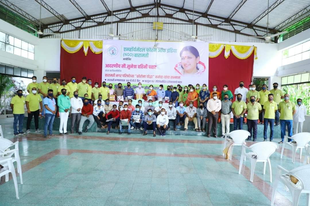 यामध्ये गेली आठ महिने कोरोना महामारीमध्ये मृत्युमुखी पडणाऱ्या रुग्णांच्या अंत्यविधीची जबाबदारी समर्थपणे पार पाडत असणाऱ्या बारामती नगर परिषदेच्या “कोरोना योद्धा” कर्मचाऱ्यांचा स्मृतिचिन्ह व रोप देऊन सन्मान करण्यात आला. तसेच सामाजिक बांधिलकीच्या जाणिवेतून कोरोना संसर्गाशी दोन हात करणाऱ्या योध्यांना आवश्यक असणाऱ्या १०० पी पी ई किटचे वाटप करण्यात आले आणि सर्वात महत्वाचे म्हणजे ज्या रुग्णांना कोरोनाची लागण झाली आहे, यातील ज्या रुग्णांची प्रकृती खूप खालावते, ज्यांना श्वास घ्यायला त्रास होऊ लागतो, अशावेळी त्या अत्यवस्थ रुग्णाला आवश्यक असणाऱ्या “रेमडीसीविर” या १५७ इंजेक्शनचे वाटप शासकीय रुग्णालयांना भेट देण्यात आली.