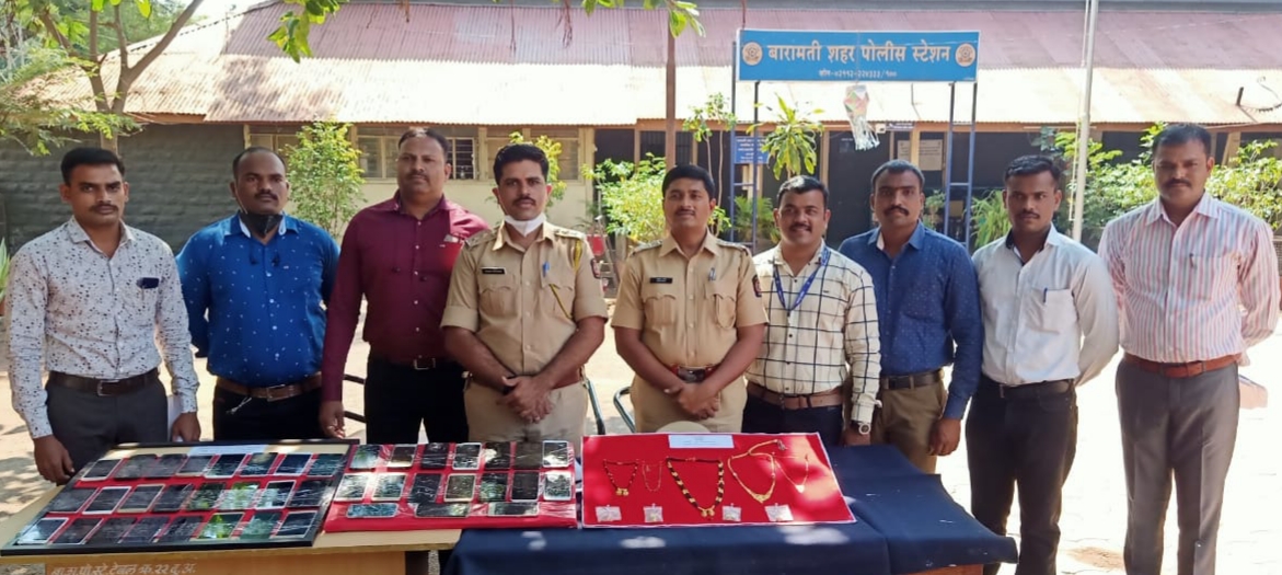 दुसर्या एका गुन्ह्यात मारवाड पेठ कृष्णा डेअरी शेजारील बारामती येथील निरंजन दिलीप पारेख यांचे मोबाईल दुरुस्तीचे दुकानाचा दरवाजा उचकटून 41 वेगवेगळ्या कंपनीचे मोबाईल हँडसेट अंदाजे किंमत तीन लाख 44 हजार 333 चोरी केल्याचा गुन्हा बारामती पोलीस स्टेशनला दाखल झाला होता त्याचा शोध पोलीस कसून करत असताना आरोपी बालाजी उर्फ बाल्या अनिल माने ,कैकाडगल्ली बारामती यास ताब्यात घेतले व अधिक तपास केला असता त्याने कबुली दिली की त्याच्या बरोबर असणारे साथीदार 1)आतीफ नजमुद्दिन तांबोळी चिमण शहा मळा बारामती 2) साहिल अय्याज शकीलकर, जामदार रोड कसबा 3 ) प्रतीक दिलीप रेडे, बाबर गल्ली 4 ) अनिकेत गायकवाड ,बारामती 5) सलमान बागवान ,कचेरी रोड बारामती (फरारी )व दोन अल्पवयीन बालक यांच्यासह गुन्हा केला होता त्याची कबुली आरोपींनी दिली असून आरोपींना पोलिस कस्टडी घेऊन सर्व मोबाईल रुपये तीन लाख 44 हजार 333 किमतीचे हँडसेट हस्तगत करून पुराव्या कामी जप्त करण्यात आले आहेत वरील तीन, सहा व सात आरोपी अद्याप फरार आहेत त्यांचा शोध चालू आहे आरोपींना चार दिवसांची पोलीस कोठडी मिळाली आहे