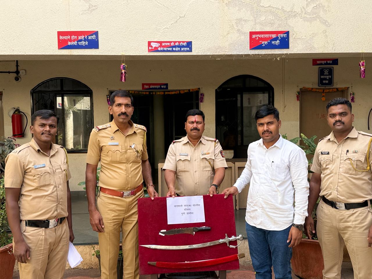 भा.न्या.संहिता कलम १९४(२) अंतर्गत दुसऱ्या एका गुन्ह्यातील आरोपींचा शोध घेत असताना बारामती तालुका पोलिसांना गोपनीय माहिती मिळाली की, समर्थ मल्हारे हा इसम तलवार बाळगत आहे. त्यानंतर पोलीस निरीक्षक चंद्रशेखर यादव यांनी तात्काळ सूत्रे हलवली. त्यांच्या मार्गदर्शनाखाली पोलिसांनी एमआयडीसी परिसरातील श्रायबर डायनामिक्स डेअरी चे शेजारचे परिसरात छापा टाकून मल्हारे यास ताब्यात घेतले. चौकशीत त्याने तलवार घरी ठेवल्याचे सांगितल्यावर पोलिसांनी त्याच्या घराची झडती घेतली असता एक तलवार आणि लोखंडी कोयता मिळून आला. या प्रकरणी आरोपीविरुद्ध बारामती तालुका पोलिस ठाण्यात भारतीय हत्यार कायदा कलम ४,२५ अंतर्गत गुन्हा नोंदविण्यात आला आहे.