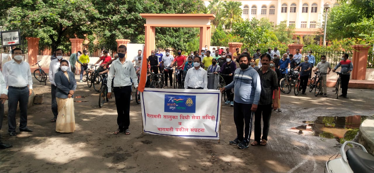 अमृतमहोत्सव’ या त्यानिमित्त बारामती विधि सेवा समिति व बारामती वकील संघटना यांच्या संयुक्त विद्यमाने दिनांक 2 ऑक्टोबर २०२१ रोजी सकाळी ठीक 8 वाजता सायकल रैली चे आयोजन करण्यात आले होते त्यावेळी मा जिल्हा न्यायधीश मा दरेकर मॅडम यांच्या हस्ते महात्मा गांधी यांच्या प्रतिमेस पुष्पहार अर्पण करण्यात आले व मा जिल्हा न्यायधीश भालेराव साहेब यांच्या हस्ते माजी पंत प्रधान लाल बहादुर शास्त्री यांच्या प्रतिमेस पुष्पहार अर्पण केले व वकील संघटने चे अध्यक्ष अॅड़ चंद्रकांत सोकटे यांचे हस्ते प्रतिमेचे पूजन करून जयंती साजरी केली व मा दरेकर मैडम यानी सायकल रैली चा शुभारंभ केला यावेळी मा न्यायधीश बांगड़े साहेब उपस्थित होते.