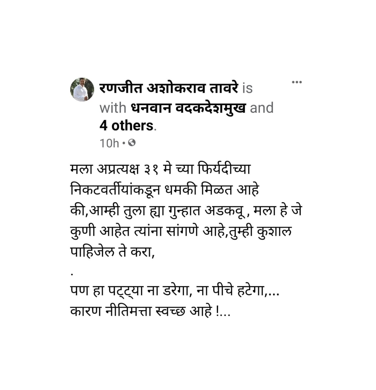 मात्र आता या प्रकरणाला वेगळेच वळण लागले असून कारखान्याचे अध्यक्ष बाळासाहेब तावरे यांचे पुतणे रणजीत तावरे यांनाही रविराज तावरे यांच्या नातेवाईकांकडून धमकी देत असल्याचे त्यांनी फेसबुकवर लिहिलेल्या पोस्टवरून दिसत आहे. त्यामुळे एकंदरीतच या प्रकरणाविषयी बारामती तालुक्यात वेगवेगळ्या चर्चेला उधाण आले आहे.