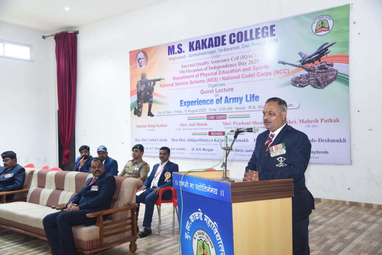 79 व्या स्वातंत्र्यदिनाचे औचित्य साधून सोमेश्वरनगर येथील मु. सा. काकडे महाविद्यालयात राष्ट्रीय सेवा योजना विभाग, राष्ट्रीय छात्र सेना, शारीरिक शिक्षण व क्रीडा विभाग तसेच संरक्षण आणि सामरिक शास्त्र विभाग यांच्या संयुक्त विद्यमाने ‘सैनिकी जीवनातील अनुभव’ या आगळ्या-वेगळ्या कार्यक्रमाचे आयोजन करण्यात आले. या कार्यक्रमात आजी-माजी सैनिकांचा सन्मान करण्यात आला.
