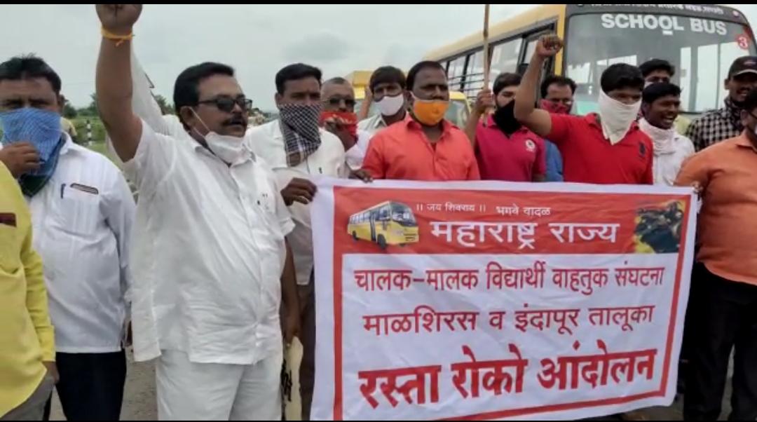 देशात व राज्यात आलेल्या कोविड 19 च्या महामारीमुळे महाराष्ट्रातील सर्व स्कूल बस चालक-मालक धारकांवर उपासमारीची वेळ आली असून संघटनेच्या वतीने आज दि.10 ऑगस्ट रोजी सकाळी साडे अकराच्या दरम्यान इंदापुर येथील डोंगराई हॉटेल पुणे-सोलापूर राष्ट्रीय महामार्ग या ठिकाणी रास्तारोको आंदोलन करण्यात आले.यावेळी विविध घोषणा देत खालील मागण्यांचे निवेदन नायब तहसीलदार अभंगराव यांच्याकडे देण्यात आले.