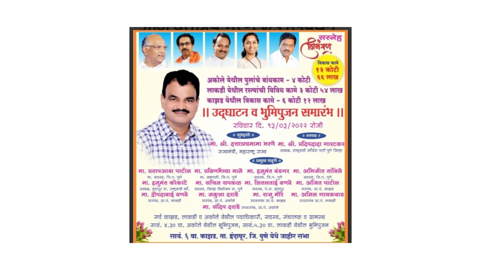 कार्यक्रमाच्या अध्यक्षस्थानी राष्ट्रवादी काँग्रेस पक्षाचे पुणे जिल्हाध्यक्ष प्रदीप गारटकर हे असणार आहेत तर प्रमुख पाहुणे म्हणून पुणे जिल्हा परिषदेचे माजी सदस्य प्रतापराव पाटील, जिल्हा परिषदेचे आरोग्य व बांधकाम विभागाचे माजी सभापती प्रवीण माने, जिल्हा परिषद सदस्य हनुमंत बंडगर, जिल्हा परिषद सदस्य अभिजित तांबिले, तालुकाध्यक्ष हनुमंत कोकाटे, जिल्हा नियोजन समितीचे सदस्य सचिन सपकळ, पंचायत समिती सदस्य शितल वनवे, काझड चे सरपंच अजित पाटील, उपसरपंच राजू मोरे,लाकडी चे सरपंच द्रोपदा वणवे, उपसरपंच अनिल गायकवाड, अकोले चे सरपंच नकुशा दराडे, उपसरपंच संदीप दराडे हे असणार आहेत.