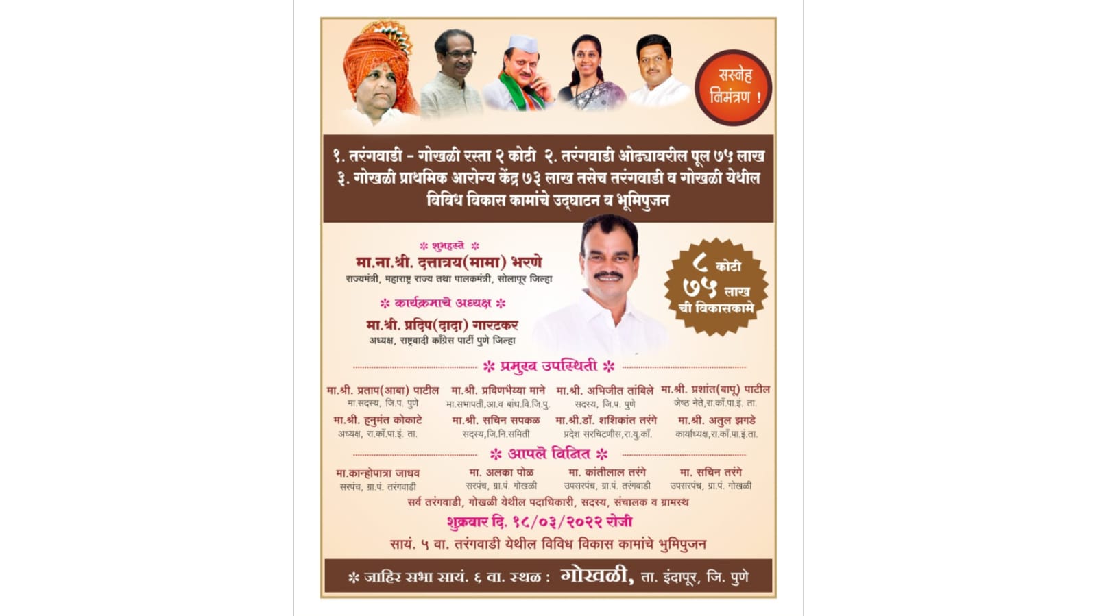 इंदापूर तालुक्यातील मौजे तरंगवाडी व गोखळी येथे शुक्रवारी (दि.१८) सोलापूर जिल्ह्याचे पालकमंत्री तथा राज्यमंत्री दत्तात्रय भरणे यांच्या हस्ते ८ कोटी ७५ लाख रुपयांच्या विविध विकासकामांचा भूमिपूजन व उद्घाटन समारंभ संपन्न होणार आहे.