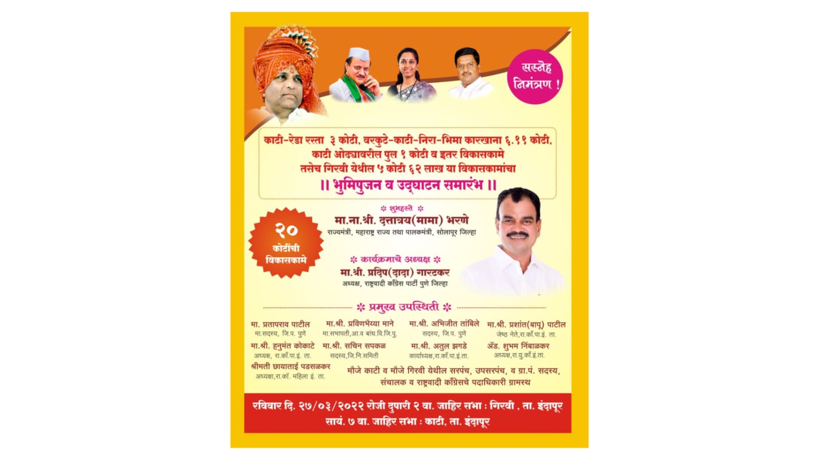 सदरील निधीतून काटी-रेडा-रेडणी रस्ता, वरकुटे-काटी-नीरा भीमा कारखाना रस्ता, काटी येथील ओढ्यावरील पूल तसेच काटी आणि गिरवी येथील विविध विकास कामांचा भूमिपूजन व उद्घाटन समारंभ संपन्न होणार आहे.