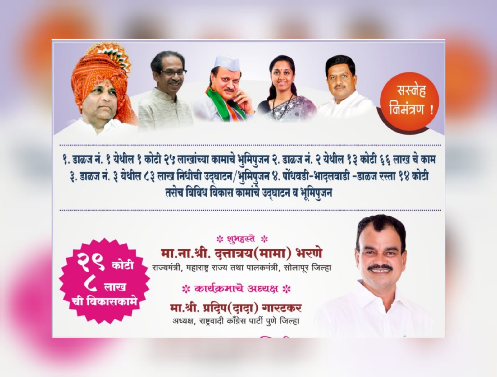 या कार्यक्रमाच्या अध्यक्षस्थानी राष्ट्रवादी काँग्रेस पक्षाचे पुणे जिल्हा अध्यक्ष प्रदीप गारटकर हे असणार आहेत तर छत्रपती सहकारी साखर कारखान्याचे माजी चेअरमन बाळासाहेब घोलप, पुणे जिल्हा परिषदेच्या सदस्या वैशाली पाटील,पुणे जिल्हा परिषदेचे माजी सदस्य प्रतापराव पाटील, पुणे जिल्हा परिषदेचे बांधकाम व आरोग्य विभागाचे माजी सभापती प्रवीण माने,पुणे जिल्हा परिषदेचे सदस्य हनुमंत बंडगर,राष्ट्रवादी काँग्रेसचे तालुकाध्यक्ष हनुमंत कोकाटे, जिल्हा नियोजन समितीचे सदस्य सचिन सपकळ,पंचायत समितीच्या सदस्या शितल वणवे, राष्ट्रवादी काँग्रेसचे नेते डी.एन. जगताप,राष्ट्रवादी काँग्रेसचे नेते नंदकुमार पानसरे,युवक राष्ट्रवादी काँग्रेसचे तालुकाध्यक्ष ॲड.शुभम निंबाळकर, डाळज नं.२ चे सरपंच ॲड. प्रदीप जगताप, उपसरपंच धनश्री डोईफोडे,डाळज नं.१ चे सरपंच विकास कुंभार,उपसरपंच प्रमिला झोळ,डाळज नं.३ च्या सरपंच प्रियंका गलांडे, उपसरपंच विश्वजीत गायकवाड यांच्यासह सर्व ग्रामपंचायत सदस्य, संचालक,पदाधिकारी व ग्रामस्थ यांची प्रमुख उपस्थिती असणार आहे.तसेच डाळज नं.२ येथे सायंकाळी ६ वाजता जाहीर सभा होणार आहे.
