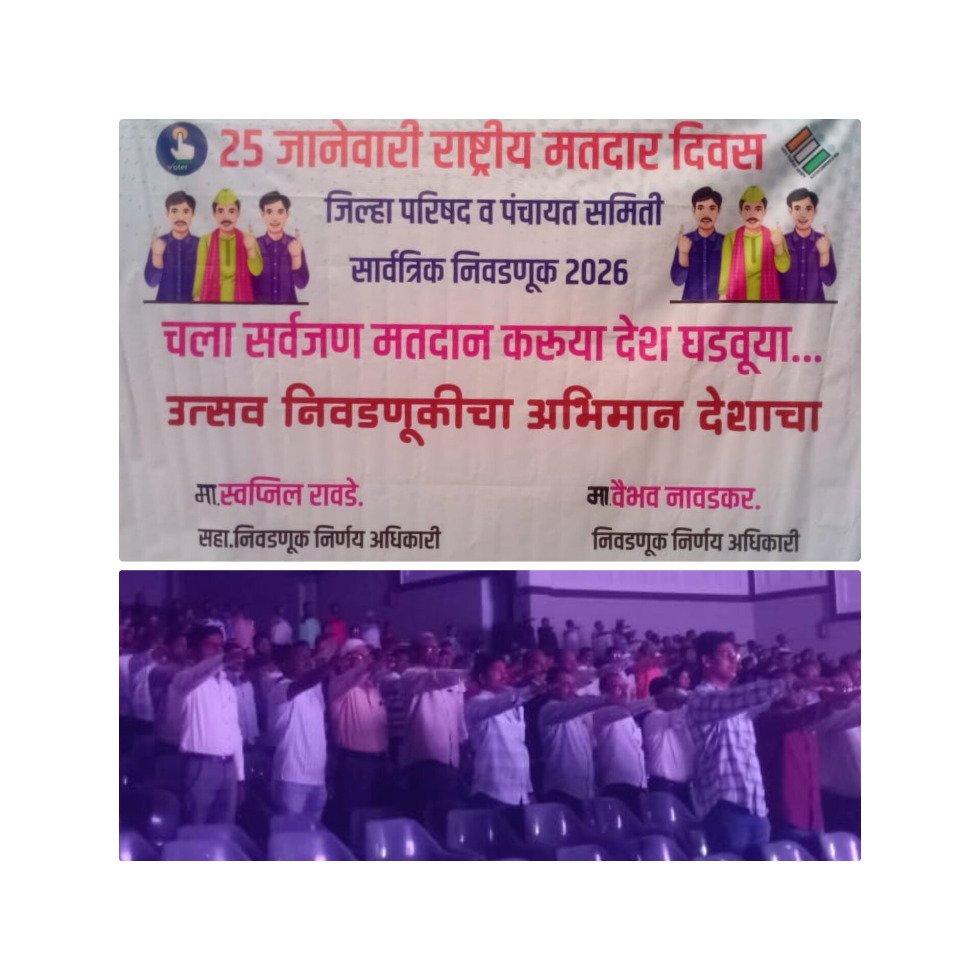 बारामती तालुका प्रचार-प्रसिद्धी अंतर्गत आज, 25 जानेवारी रोजी राष्ट्रीय मतदार दिनानिमित्त मतदान प्रतिज्ञा कार्यक्रमाचे आयोजन करण्यात आले. या कार्यक्रमात नागरिकांनी लोकशाही बळकट करण्यासाठी आपला मतदानाचा हक्क निर्भयपणे व जबाबदारीने बजावण्याची प्रतिज्ञा घेतली.