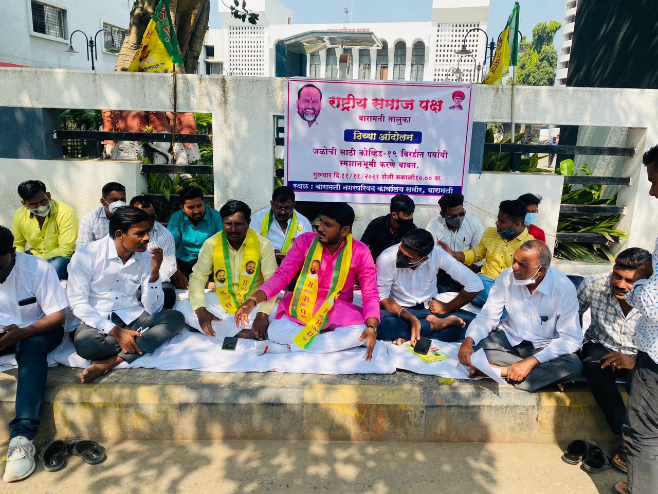 जळोची येथील स्मशानभूमीत सध्या कोव्हिड रुग्णांवर अंत्यसंस्कार केले जात आहेत. त्यामुळे अन्य लोकांसाठी स्मशानभूमी उपलब्ध नाही. परिणामी एखादे मयत झाल्यास त्यांचे दहन करायचे कुठे हा प्रश्न निर्माण होतो. या पार्श्वभूमीवर आज राष्ट्रीय समाज पक्षाच्या वतीने बारामती नगरपरिषदेसमोर ठिय्या आंदोलन करत पर्यायी स्मशानभूमीचे बांधकाम करण्याची आग्रही मागणी करण्यात आली.