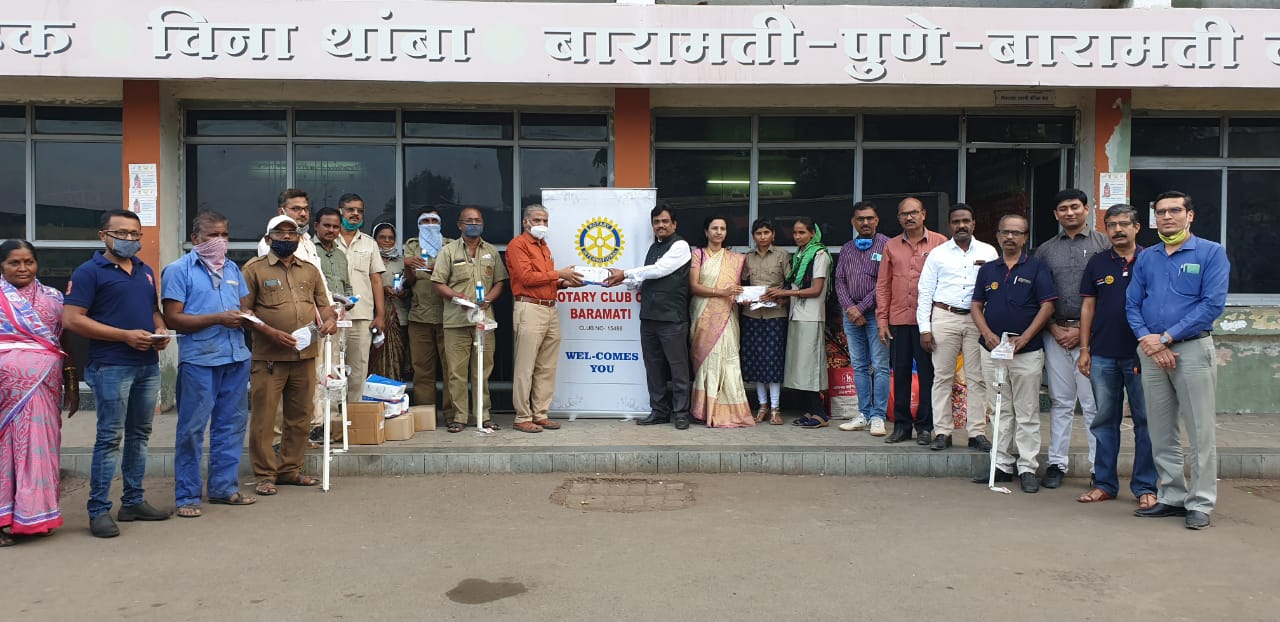 हया वेळी १५० मास्क, १५ सॅनिटायझर स्टँड व सॅनिटायझर आगार प्रमुख मा. श्री गोंजारी साहेब हयाचे कडे सुपूर्त करण्यात आले. हया वेळी रोटरी क्लब ऑफ बारामती चे अध्यक्ष श्री हणमंतराव पाटील उपअध्यक्ष महावीर शहा सचिव विजय इंगळे, प्रतिक दोशी, स्वप्निल मुथा, मल्लिकार्जुन हिरेमठ ,दत्ताञय बोराडे, पार्श्वेंद्र फरसोले, अजित उलगडे, सौ.सुप्रिया बर्गे हे सर्वजण उपस्थित होते.
