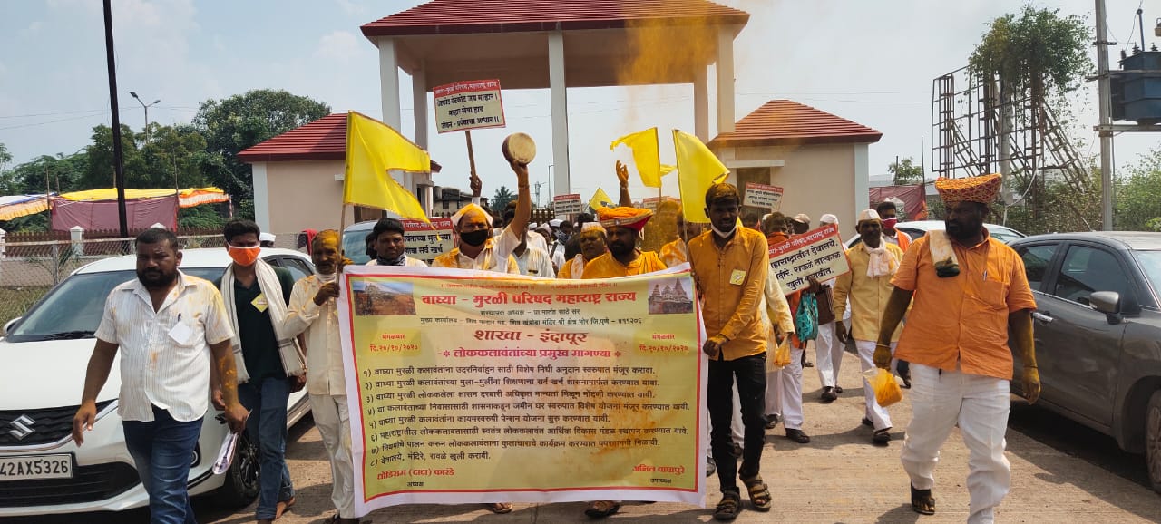वाघ्या मुरळी लोककलावंत अनादिकाळापासून कलेच्या माध्यमातून धर्मजागरण,कुलधर्म कुलाचार पालन,समाज प्रबोधन याद्वारे समाजसेवेचे कार्य करत असतात समाजातील भाविक भक्तांच्या आश्रयावर त्यांच्या कुटुंबीयांचा उदरनिर्वाह होत असतो.मात्र मागील वर्षी अतिवृष्टी त्यानंतरची निवडणूक आचारसंहिता यामुळे कलावंतांना जगण्यापुरते ही उत्पन्न मिळू शकले नाही.तसेच सध्या देखील मार्च 2020 पासून चालू असलेल्या कोरोना संकटात सापडून उपासमारीला तोंड देत आहेत. त्यामुळे आज दि.20 रोजी लोककलावंतांनी इंदापूर शहरातून विविध प्रकारचे नृत्य सादर करत विविध घोषणा देत इंदापूर प्रशासकीय कार्यालयावर अनोख्या प्रकारे आंदोलन केले तसेच पुढील प्रमाणे मागणी शासनाकडे केल्या.