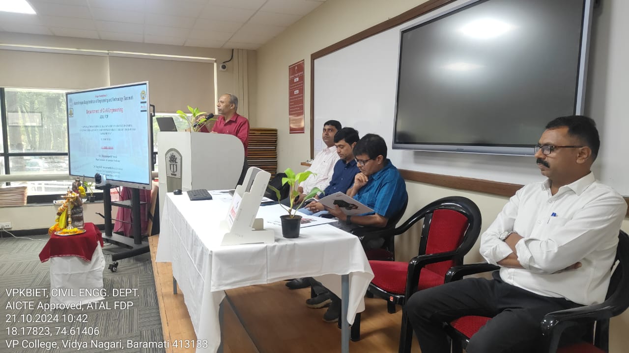 एआयसिटी, नवी दिल्ली प्रस्तुत “अटल एफडीपी” हा कार्यक्रम 21 ऑक्टोबर 2024 ते 26 ऑक्टोबर 2024 या कालावधीमध्ये महाविद्यालयाच्या मुख्य सभागृहामध्ये आयोजित करण्यात आला होता. कार्यक्रमाचा मुख्य विषय “एप्लीकेशन ऑफ स्ट्रक्चरल डायनॅमिक्स इन ॲडव्हान्सड