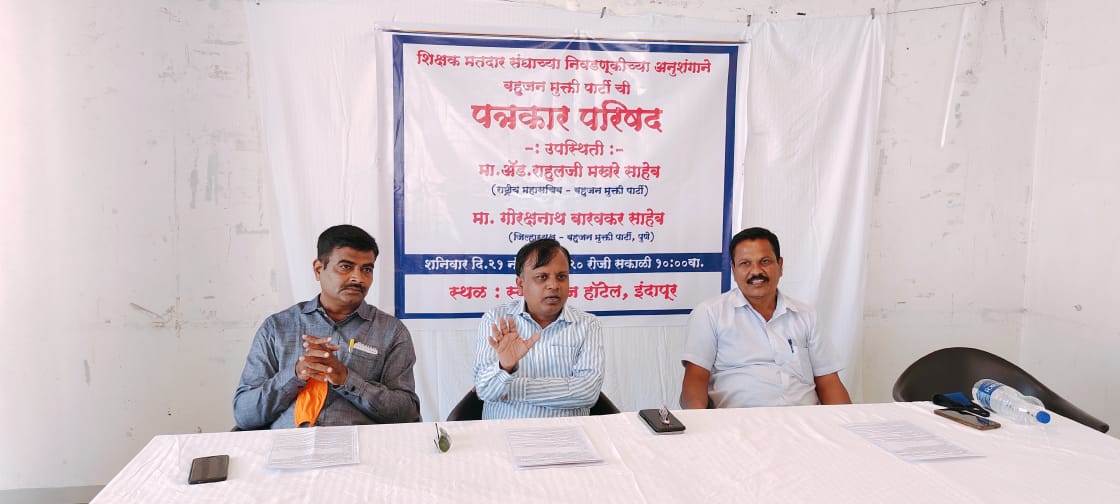 पुणे शिक्षक मतदार संघ निवडणुकीच्या पार्श्वभूमीवर आज दि.२१ रोजी बहुजन मुक्ती पार्टीच्या वतीने इंदापूर येथील स्वामीराज हॉटेल येथे पत्रकार परिषदेचे आयोजन करण्यात आले होते.यावेळी बोलताना बहुजन मुक्ती पार्टीचे राष्ट्रीय महासचिव यांनी या शिक्षक पदवीधर निवडणूकीत राष्ट्रीय मूलनिवासी बहूजन कर्मचारी संघ या राष्ट्रीय ट्रेड युनियनची भूमिका निर्णायक ठरणार असल्याचे सांगत बीएमपीचे पुरस्कृत उमेदवार रवींद्र सोलनकर यांची उमेदवारी राष्ट्रीय स्तरावरील शिक्षक संघटनेकडून दिल्यामुळे सोलनकर हे जिंकण्याच्या शर्यतीत आल्याने पारंपरिक व प्रस्थापित पक्षांच्या उमेदवारांपुढे आव्हानं निर्माण होऊन पुणे विभाग शिक्षक मतदार संघांची निवडणूक चुरशीची ठरणार असून निकाल शिक्षक संघटनांच्या भूमिकेवर अवलंबून असल्याचे म्हंटल आहे.