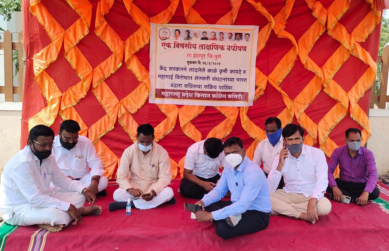 केंद्र सरकारने पारित केलेले नवे कृषी कायदे व महागाईविरोधात शेतकरी संघटनांच्या भारत बंदला काँग्रेसने सक्रीय पाठिंबा दर्शवला असून महाराष्ट्र प्रदेश किसान काँग्रेस कमिटीच्या कार्यकर्त्यांनी इंदापूर तहसील कार्यालयासमोर एक दिवसीय लाक्षणिक उपोषण धरले आहे.