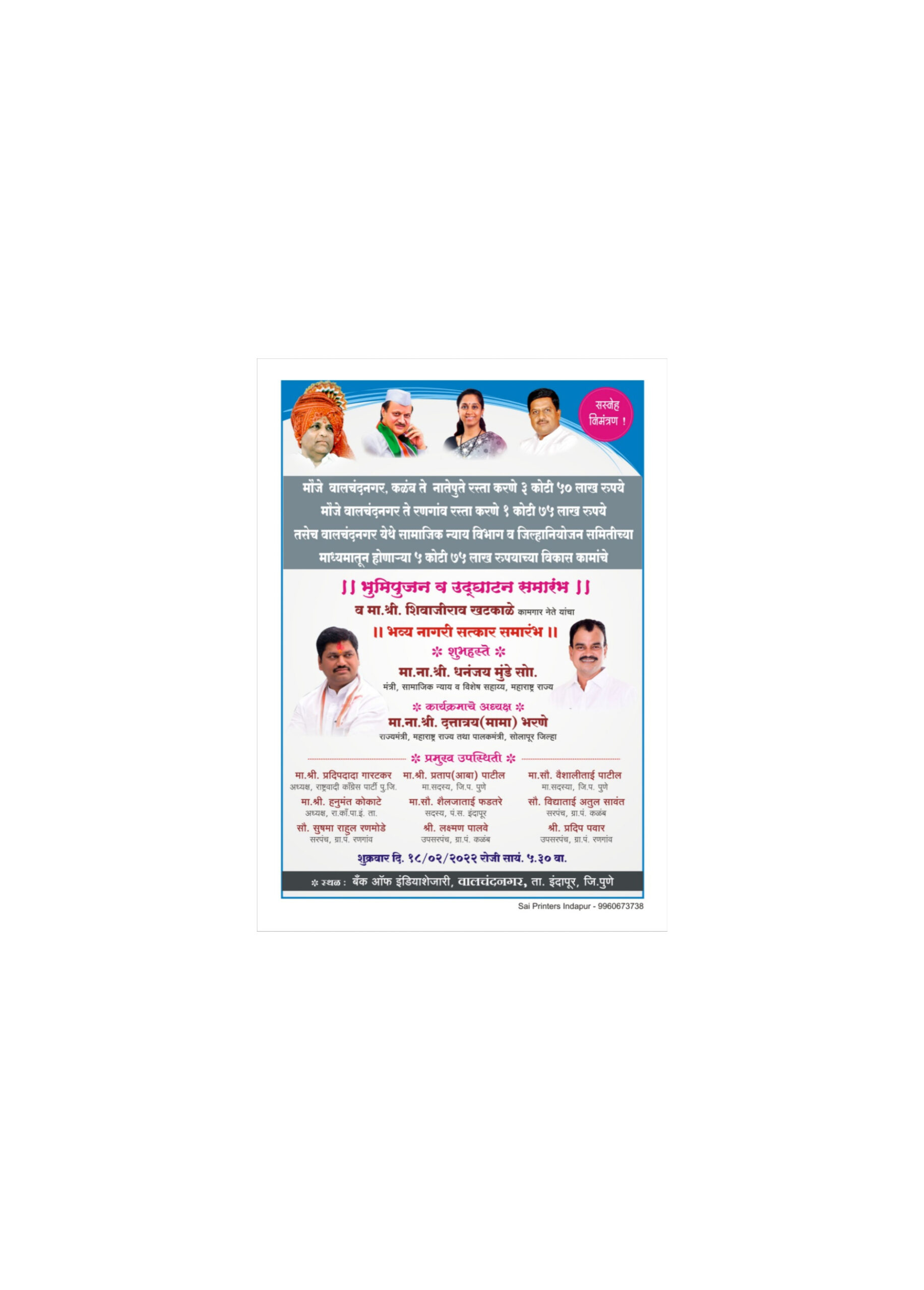 सामाजिक न्याय मंत्री धनंजय मुंडे यांच्याहस्ते व राज्यमंत्री तथा सोलापूर जिल्ह्याचे पालकमंत्री दत्तात्रय भरणे यांच्या अध्यक्षतेखाली आज (दि.१८) ११ कोटी रुपयांच्या विविध विकास कामांचे भूमिपूजन व उद्घाटन संपन्न होणार असून सायंकाळी ५.३० वाजता वालचंदनगर येथे जाहीर सभा होणार आहे.सदरील कार्यक्रमाच्या भूमिपूजन व उद्घाटन समारंभा प्रसंगी कामगार नेते शिवाजीराव खटकाळे यांचा जाहीर नागरी सत्कार होणार आहे.