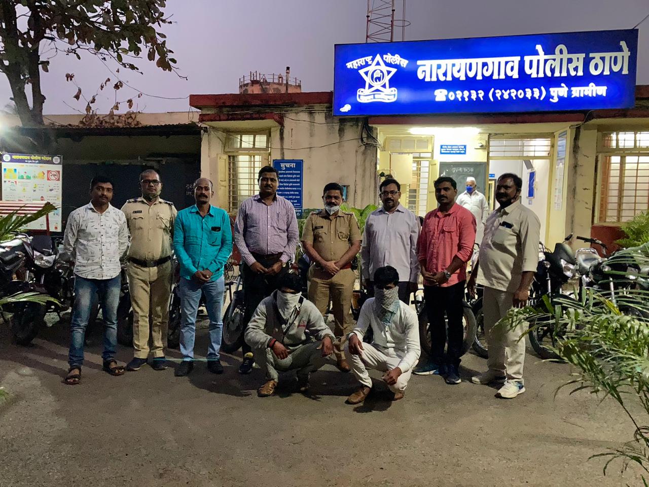 आज रोजी स्थानिक गुन्हे अन्वेषण शाखेला मा. पोलिस अधिक्षक श्री. अभिनव देशमुख सो यांजकडून दरोडा, जबरी चोरी व मोटार सायकल चोरीचे गुन्हे उघड करणे करीता मार्गदर्शनपर सुचना देण्यात आल्याने वरील आदेशा नुसार स्थानिक गुन्हे शाखेचे वरिष्ठ पोलिस निरीक्षक श्री. पद्माकर घनवट यांच्या मार्गदर्शनाखाली स्था.गु.शा. पुणे ग्रामीण चे खेड-जुन्नर पथक आज दिनांक 17/12/2020 रोजी वरील प्रमाणे गुन्हे उघड आणण्या करीता स्था.गु.शा. पुणे ग्रामिण चे जुन्नर खेड पथक पेट्रोलिंग करत असताना बातमीदारा मार्फत बातमी मिळाली कि एक इसम मोटार सायकल चोरीतील मोटार सायकल विक्री करण्या करीता पारगाव तर्फे आळे येथे येणार आहे त्या अनुषंगाने पारगाव तर्फे आळे येथे जावुन सापळा रचुन दोन संशयीत इसम व त्यांचेकडील मोटार सायकली ताब्यात घेउन त्यांना त्यांचे नाव पत्ता विचारले असता त्यांनी त्यांचे नाव 1) सचिन बाळु दिघे वय 31 वर्ष. रा. ढगेवाडी, पळसपुर ता. पारनेर जि. अहमदनगर व 2) ऋशीकेष किसन दरेकर वय 20 वर्ष. रा. पारगाव तर्फे आळे ता. जुन्नर जि. पुणे. असे सांगितले असता त्यांची व त्यांचेकडे असणारे मो.सा. ची त्यांचेकडे चौकशी केली असता सदर मोटार सायकल हया आळेफाटा व नारायणगाव परीसरातुन चोरुन आणलेल्या असल्याचे समजले सदर बाबत संबधीत पो.स्टे.कडे खात्री करता त्या बाबत गुन्हे दाखल असल्याचे समजले तरी सदर संषयीत इसमांकडे सखोल चैकषी केली असता त्यांनी त्यांचा मित्र अशिष बेल्हेकर नाव पत्ता माहिती नाही. याचे मदतीने चोरी केलेल्या व विक्री करण्या करीता जवळ बाळगलेल्या एकुण 13 मोटार सायकली किंमत अंदाजे 3,05,000/- रु. किंमतीच्या मोटार सायकली काढुन दिल्या त्या सर्व मोटार सायकली जप्ती पंचनाम्याने जप्त करुन, आरोपी व जप्त मुददेमाल रिपोर्टाने नारायणगाव पोलीस स्टेशन यांचे ताब्यात पुढील कार्यवाही करीता दिलेल्या आहेत. सदर कार्यवाहीत खालील प्रमाणे गुन्हे उघडकिस आणले आहेत.